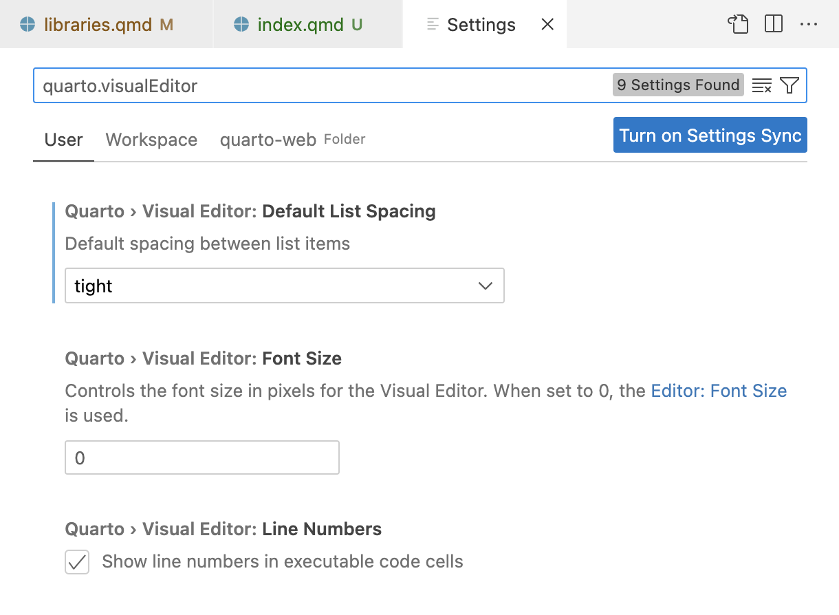 There are a variety of VS Code options available to configure the behavior of the visual editor. You can locate these options by filtering on quarto.visualEditor in the settings pane:
